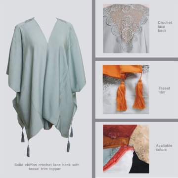 Item Code: Features:LACE BACK LIQUID CHIFFON TOPPER WITH TASSEL TRIM
