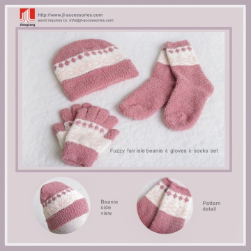Description: Fuzzy fair isle beanie & gloves & socks set