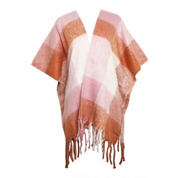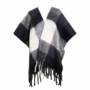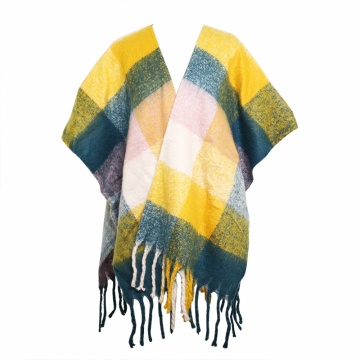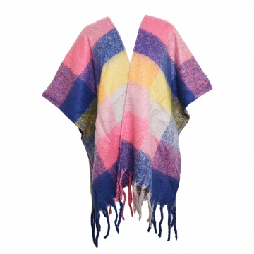 Description: poly/acrylic boucle yarn brushed plaid blanket woven ruana