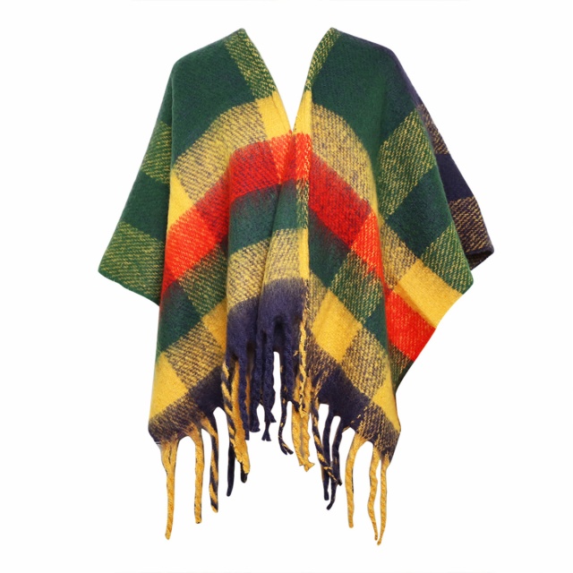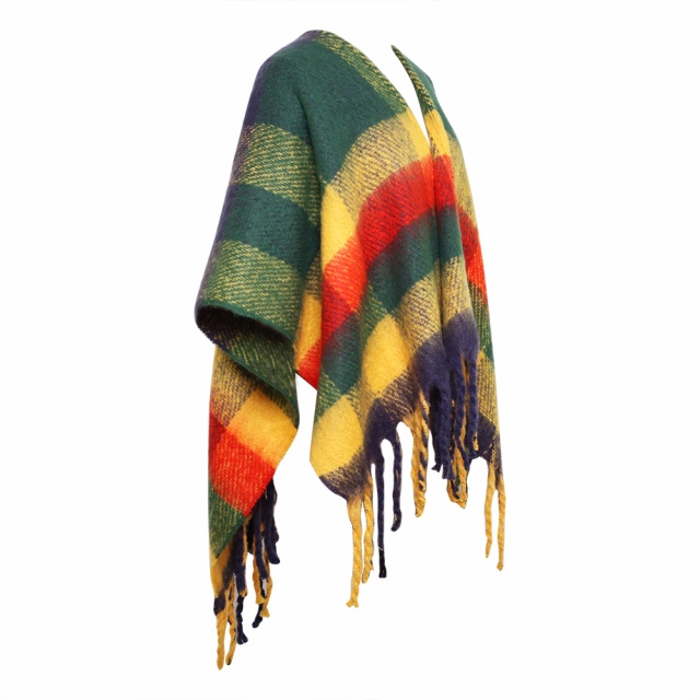 Description: poly/acrylic boucle yarn brushed plaid blanket woven ruana