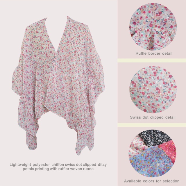 Description: 100%poly swiss dot ditzy petals printing with ruffle woven ruana