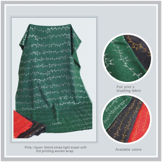 Description: 80%polyester 20%rayon xmas light super soft foil printing woven wrap