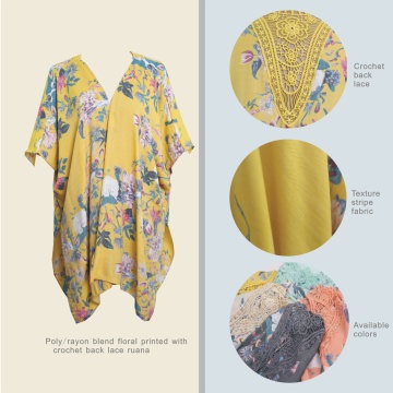 Description: 60%ryaon 40%poly parisian floral printing with lace crochet insert woven ruana